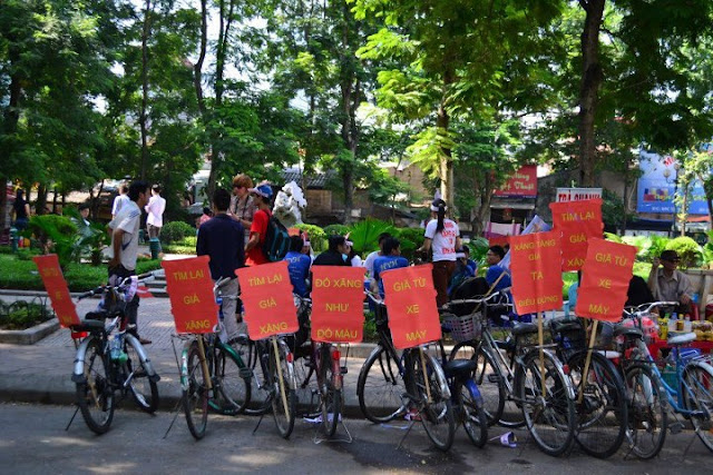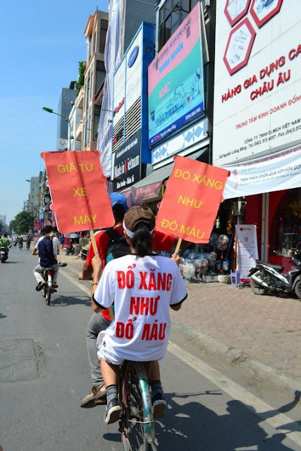 Vậy chúng tôi phải làm ǵ? Phải làm thế nào để đảm bảo được nhu cầu cuộc sống của ḿnh????? Cách duy nhất của chúng tôi có thể làm được đó là đạp xe đạp để than thở rằng “ XĂNG TĂNG GIÁ – TA ĐIÊU ĐỨNG”, để nói lên tiếng nói của mỗi người sinh viên rằng chúng tôi đó là phải “ GIĂ TỪ XE MÁY”, để nói lên tiếng nói của mỗi người dân lao động rằng “ ĐỔ XĂNG NHƯ ĐỔ MÁU”… ![]() ![]() Trên xuất cuộc hành tŕnh, chúng tôi nhận được sự đồng t́nh của rất nhiều người tham gia giao thông, có anh đă xin những chiếc mũ của chúng tôi để làm kỷ niệm, có chú lái xe bus đă xin cả những những tờ b́a của chúng tôi. ![]() Những cái vỗ tay đồng t́nh, những ánh mắt nh́n tŕu mến, những lời hỏi thăm " có mệt không cháu" " nắng như thế này đi tội thế" đă là nguồn động viên cho chúng tôi để chúng tôi cứ đi và đi tiếp. Mệt lắm, không chuyên nghiệp lắm bởi chúng tôi chỉ là tự phát, những người anh em chưa bao giờ gặp nhau, hôm nay cùng đi với nhau chưa có sự kết hợp ăn ư... Nhưng niềm vui của tôi đă vỡ ̣a khi chúng tôi đă đồng hành cùng nhau, đă nói được tiếng nói của ḷng ḿnh và nhận được sự hưởng ứng của mọi người. ![]() Cũng có rất nhiều bạn trẻ nói rằng "đi như thế này có thay đổi được ǵ đâu? tăng th́ nó vẫn tăng...." nhưng các bạn trẻ ơi " sức chịu đựng của con người có giới hạn". Các bạn thừa biết rằng, các bạn đă không dám ăn sáng để lên giảng đường, đă cắt giảm liên kết qua điện thoại, ngày chỉ vào máy tính vài 3 lần, có khi nhiều bạn trẻ c̣n trùm mềm máy tính... đó là chưa kể đến sự vất vả của người dân lao động, những người từ vùng quê nghèo ra Hà Nội để mưu sinh... 1 ḿnh tôi không thể làm được, 1 ḿnh bạn không thể làm được... nhưng tất cả chúng ta sẽ làm được... Chưa thử sao biết được. XĂNG ƠI - ĐỪNG TĂNG NỮA NHÉ ![]() Chúng tôi chỉ là tự phát - chúng tôi chỉ là những người anh em - giọt nước mắt t́nh thân - cầu mong những người anh em của tôi luôn b́nh an và hạnh phúc. Thương lắm... Cát Bụi |