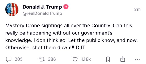 "Những vụ nh́n thấy máy bay không người lái bí ẩn trên khắp đất nước. Liệu điều này có thực sự xảy ra mà chính phủ của chúng ta không biết không? Tôi không nghĩ vậy!" Trump viết trên Truth Social. "Hăy cho công chúng biết, và ngay bây giờ.