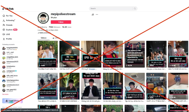 Để thu hút được nhiều "con mồi", Mr Pips, Mr Hunter tận dụng triệt để mạng xă hội TikTok và Facebook. Hai đối tượng này thường xuyên đăng tải các clip chia sẻ về kinh nghiệm đầu tư, cách kiếm tiền, dạy cách làm giàu.