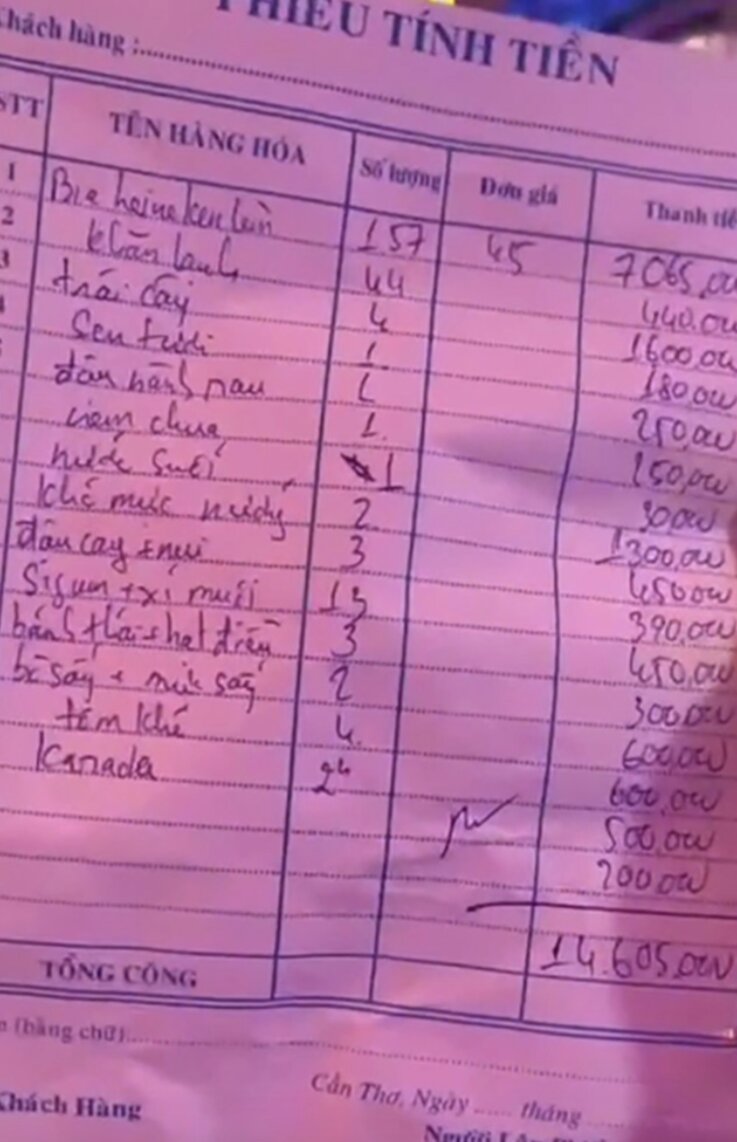 Theo hóa đơn, nhóm khách này vào quán hát trong vòng 2 giờ, tiền hát hết 600 nghìn đồng (300 nghìn đồng/giờ). Tuy nhiên, tổng hóa đơn lên tới 14,6 triệu đồng, trong đó có một số mục: Bia 157 chai (45.000 đồng/chai); Trái cây (1,6 triệu đồng/4 đĩa); Khô mực nướng: 1,3 triệu đồng; Bánh thái + hạt điều: 450 nghìn đồng; Nem chua: 250 nghìn đồng; Khăn ướt: 440 nghìn đồng;...