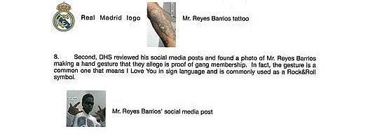 Một người tự xưng cầu thủ bóng đá chuyên nghiệp, Jerce Reyes Barrios bị chính quyền Mỹ cáo buộc là thành viên băng đảng bạo lực, vì hình xăm Real Madrid.