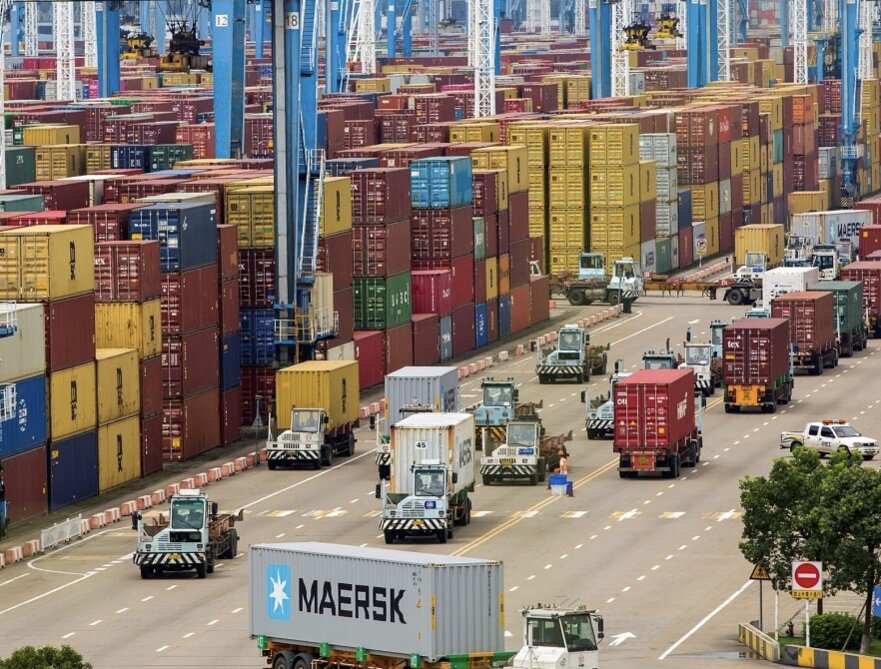 Xe tải và container tại cảng Ninh Ba Chu San ở Chiết Giang (Trung Quốc). Ảnh: Reuters
