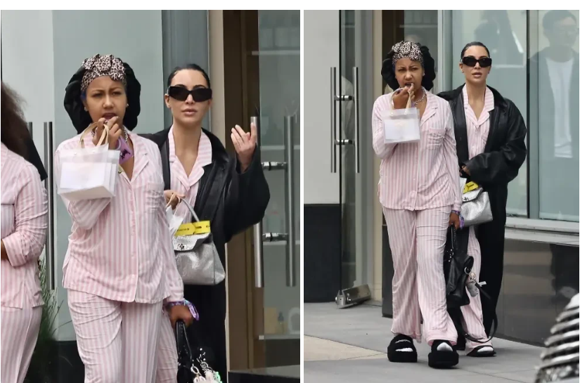 Hai mẹ con được nhìn thấy rời khỏi một spa ở Los Angeles hôm Chủ Nhật. Cả hai diện đồ ngủ đồng bộ kẻ sọc hồng, trắng và quần dài. Kim Kardashian khoác thêm áo trench coat đen, đeo túi bạc và kính râm. Trong khi đó, North West tạo điểm nhấn bằng nhiều vòng cổ xếp lớp và bông tai đính đá.