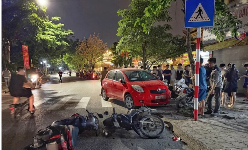 Tại hiện trường, phần đầu ôtô bị hư hỏng nặng, nhiều xe máy nằm la liệt trên đường và vỉa hè, có xe bị bung yên, biến dạng. Cú va chạm mạnh khiến 3 người bị thương, trong đó 2 người được đưa vào cấp cứu tại bệnh viện.