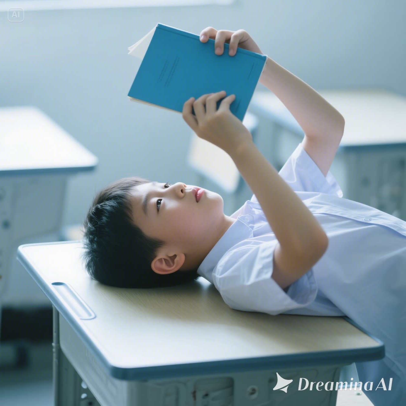 Một cậu bé đang nằm dài trên bàn học, mắt lờ đờ, tay cầm sách lật ngược.