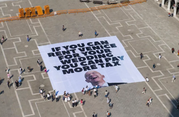 Hôm 23/6, nhóm chống giới tỉ phú Anh “Everyone Hates Elon” (Ai cũng ghét Elon), phối hợp với Greenpeace Italy, đă trải một tấm biểu ngữ khổng lồ trên nền đá ở Quảng trường St. Mark. Trên biểu ngữ có ḍng chữ: “Nếu anh có thể thuê Venice cho đám cưới của ḿnh, th́ anh cũng có thể đóng thuế nhiều hơn”, kèm theo h́nh ảnh tỉ phú đang cười lớn.