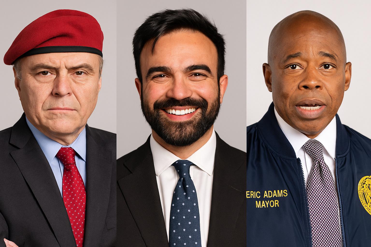 H́nh ảnh tổng hợp do Antonio Graceffo tạo ra, sử dụng ảnh báo chí có sẵn hoặc được cấp phép của Curtis Sliwa, Zohran Mamdani và Eric Adams. Chỉnh sửa và sắp xếp bằng công cụ AI.
