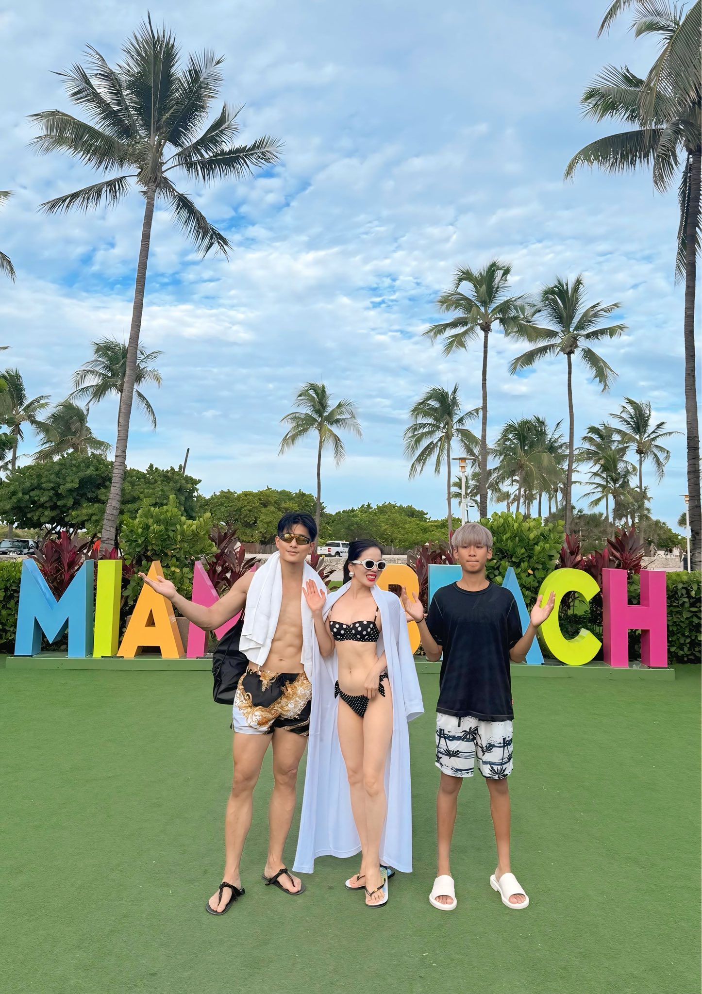 Lệ Quyên cùng người yêu và con trai tắm biển ở Miami, bang Florida (Mỹ).