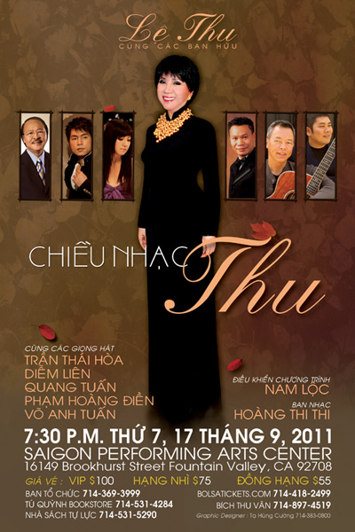 FOUNTAIN VALLEY (NV) - Ca sĩ Lệ Thu sẽ trình diễn trong chương trình nhạc thính phòng “Chiều Nhạc Thu” được tổ chức vào lúc 7 giờ 30 tối Thứ Bảy, 17 Tháng Chín, tại Saigon Performing Arts Center, 16149 Brookhurst Street, Fountain Valley, CA 92708.