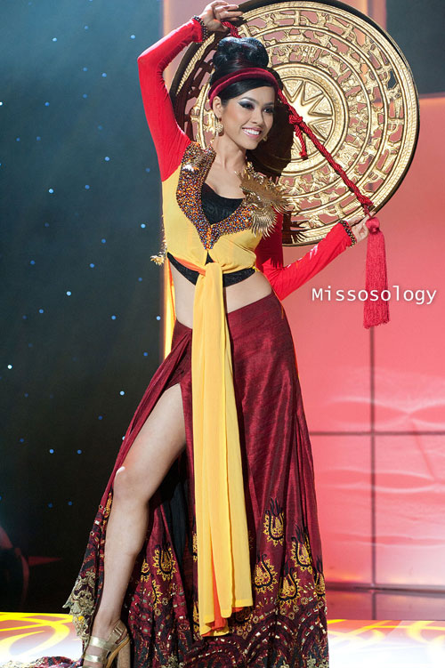 Trong bộ áo tứ thân cách điệu tôn lên những đường cong gợi cảm, người đẹp Việt Nam trình diễn rất tự tin trên sân khấu Hoa hậu Hoàn vũ.