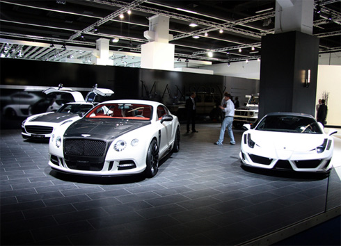 | Continental GT đứng giữa Ferrari Siracusa (bên phải) và SLS AMG tại gian hàng của Mansory ở Frankfurt Motor Show 2011. |
