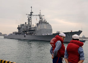 Các binh sỹ của Hải quân Hàn Quốc đang chuẩn bị đón các thuỷ trên tuần dương hạm tên lửa USS Cowpens (CG 63) - chiến hạm đi cùng tàu sân bay USS George Washington (CVN 73) đến cảng Busan.