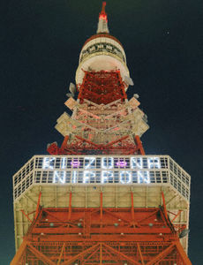 Tháp Tokyo được thắp sáng với dòng chữ Kizuna Nippon (Sự kết nối của tình hữu nghị Nhật Bản). |