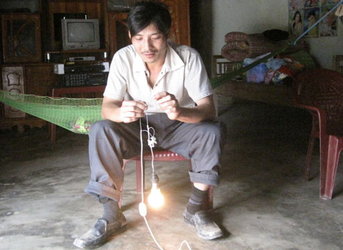 | Anh Hùng vừa kể chuyện vừa dùng tay trần nối bóng điện mà không bị giật. Ảnh: H.B |