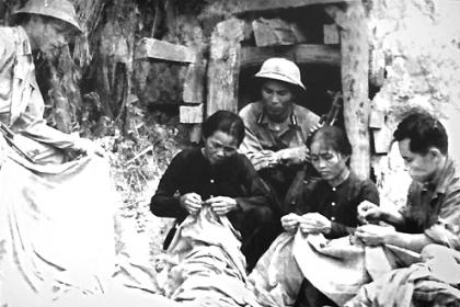 Mẹ Viễn (bên phải) và mẹ Diệm đang vá cờ bên bờ Hiền Lương trong những năm chống Mỹ cứu nước (1967). Ảnh tư liệu