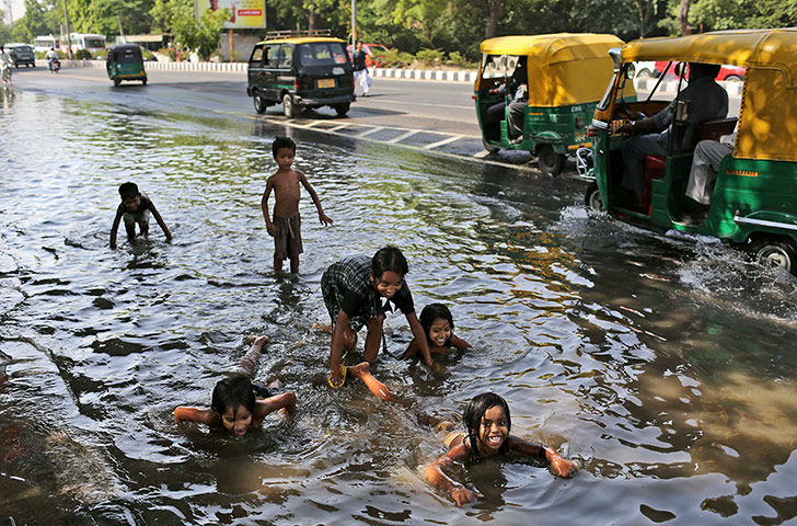 Trẻ em tắm trên đường phố ngập nước do ống nước bị vỡ ở New Delhi, Ấn Độ.