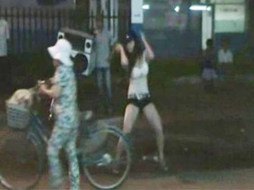 Tưởng rằng cô gái sẽ bỏ ngoài tai những lời ong bướm của cánh đàn ông, ai dè nữ “vũ công” khoảng 20 tuổi này lập tức “xuất thần”, cởi bỏ áo khoác bên ngoài, trong trang phục nhìn xuyên thấu nội y, cô gái nhảy ra giữa đường “quằn quại” trong vũ điệu khiêu dâm, đầu tóc rũ rượi, với những động tác như ở trong “phòng the”.