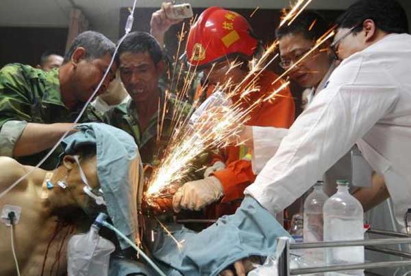 Bức ảnh trên ghi lại hình ảnh cắt thanh kim loại mà một công nhân bị găm vào người. Lính cứu hỏa dùng máy cắt để cắt ngắn những thanh thép dưới sự giám sát chặt chẽ của các bác sĩ. Nhân viên y tế cho bệnh nhân dùng thuốc và nước muối để hạ nhiệt thanh kim loại. Sau khi cắt ngắn, bệnh nhân được chuyển tới phòng phẫu thuật để lấy các thanh thép ra khỏi người. May mắn là ca phẫu thuật thành công.