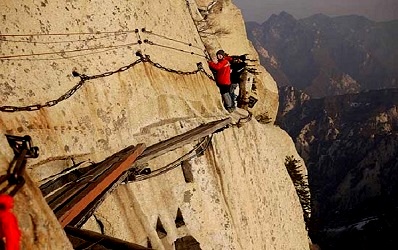 Phải những người có thần kinh thép mới dám đi qua con đường này bởi chỉ cần sảy chân một chút thôi là tan xác dưới vực thẳm sâu hun hút. Con đường này nằm trên ngọn núi Hoa Sơn nổi tiếng cheo leo và hiểm trở ở phía Nam thành phố Hoa Âm, cách 120km về phía Đông thành phố Tây An, Trung Quốc.