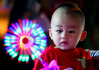 Một trẻ em thích thú ngắm nhìn đèn phát sáng phát ra từ một đồ chơi.