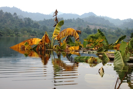 Nước lên khiến những cây chuối to, cao cũng chỉ c̣n nổi phần ngọn |