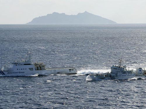 Tàu tuần tra Nhật Bản (trái) và tàu Trung Quốc ở đảo Uotsuri thuộc Senkaku/Điếu Ngư hôm 1-10