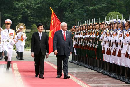 | Chủ tịch nước Trương Tấn Sang và Tổng thống Panama, Ricardo Martinelli Berrocal duyệt đội danh dự QĐNDVN. Ảnh : TTXVN | Sau lễ đón chính thức, Chủ tịch nước Trương Tấn Sang đă hội đàm với Tổng thống Ricardo Martinelli Berrocal.