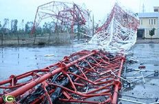 Tháp truyền hình cao nhất miền Bắc của tỉnh Nam Định bị gió bão giật đổ sập ra đường. Ảnh: Việt Dũng/Tuổi trẻ
