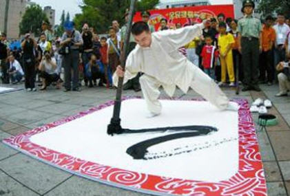 | Ông Mai biểu diễn thư pháp với cây bút thép nặng hàng chục cân. |