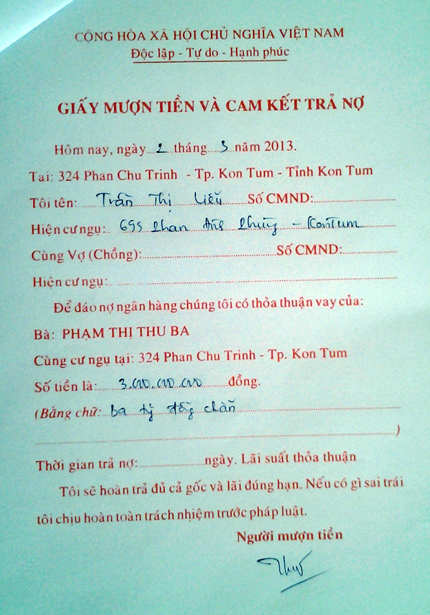 | | Các giấy vay nợ để làm đáo hạn của bà phó phòng tín dụng ngân hàng nông nghiệp và phát triển nông thôn tỉnh Kon Tum | Là người cho bà Liễu vay với số tiền lên đến gần 24 tỷ đồng, bà Phạm Thị Thu Ba (51 tuổi, trú tại số nhà 324 Phan Chu Trinh, phường Quyết Thắng, TP. Kon Tum) kể lại.