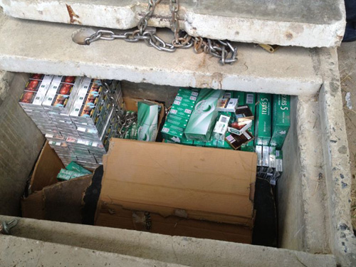 Được khóa bằng xích kim loại và phải mở bằng dụng cụ chuyên dụng, chiếc hố ga có chiều sâu bằng nửa chiều cao con người chứa bên trong hơn 1.020 gói thuốc lậu.