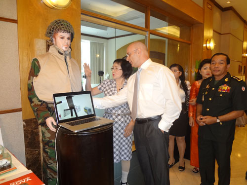 PGS.TS Nguyễn Thị Hòe giới thiệu áo chống đạn làm bằng vải có phủ sơn nano làm từ trấu - Ảnh: Mai Vọng |