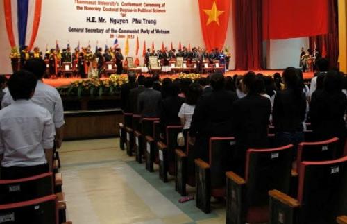 Lúc 09h sáng nay, 26/6/2013, giáo sư chuyên ngành xây dựng đảng Nguyễn Phú Trọng đã chính thức được trường đại học Thammasat (Thái Lan) trao bằng tiến sĩ danh dự ngành chính trị học.