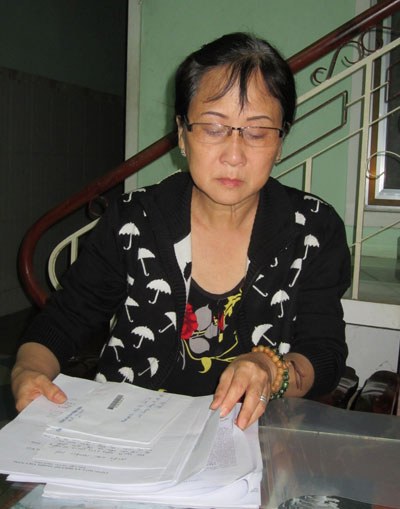Bà Tú với tập giấy nhận nợ số tiền 25 tỉ đồng của vợ chồng bà Liễu |