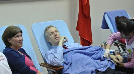 Đại sứ Mỹ, ngài Ted Osius, là một trong những người đầu tiên tham gia hiến máu trong đợt hiến máu sáng nay 15-1 do Đại sứ quán Mỹ tại Hà Nội và Viện Huyết học - Truyền máu Trung ương đồng tổ chức.