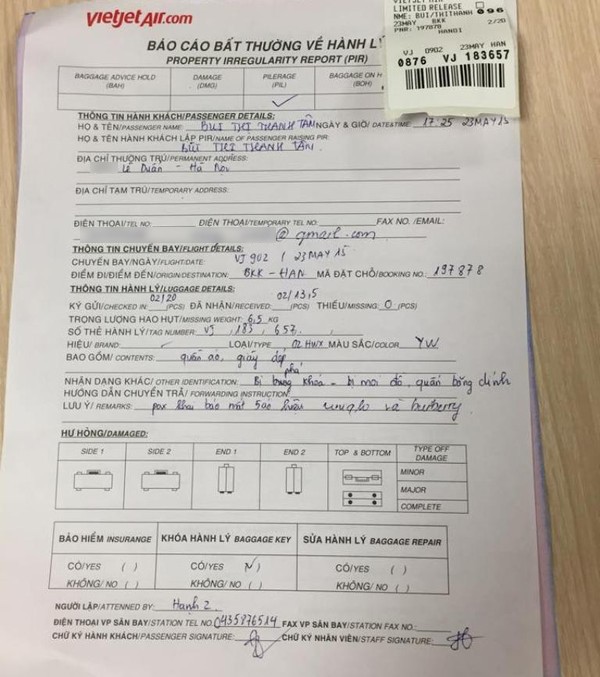 Chị Phương Anh cũng cho hay, một nhân viên Vietjet đă ghi nhận, lập biên bản sự việc và cho biết sẽ kiểm tra lại xem lỗi ở đâu rồi chủ động liên hệ lại.