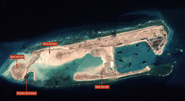 Ảnh vệ tinh một đảo nhân tạo của Trung Quốc ở Biển Đông đang được quân sự hóa - Ảnh: IHS Jane’s