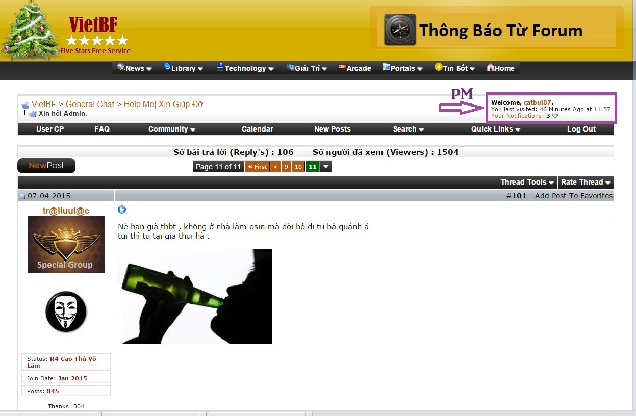 - Các bạn nhìn bên góc trái (sau banner của diễn đàn) sẽ thấy 1 cái khung "Welcome", trong đó có Private Messages .