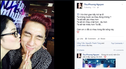 Sau màn biểu diễn chung ấn tượng tại liveshow, mới đây trên trang cá nhân của mình, Thu Phương đã đăng bức ảnh thơm má Sơn Tùng cực đáng yêu và dành những dòng ‘thổ lộ’ đặc biệt cho đàn em: “Xin thời gian hãy trở lại đi/ Ta không muốn xa nhau đúng không ?/ Ta sẽ biết yêu nhau hơn / Ta sẽ ôm nhau chặt hơn , lâu hơn/ Ta sẽ hát nhiều hơn Ta đã…Cám ơn vì đã có nhau trong đời sống này”. Những lời chia sẻ đáng yêu mà không kém phần chân thành này của nữ ca sĩ nhận được phản hồi rất tích cực và nồng nhiệt từ các fan hâm mộ.