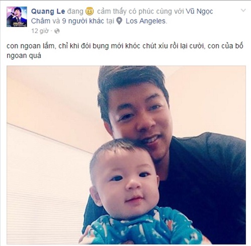 Quang Lê viết trên trang cá nhân: "Con ngoan lắm, chỉ khi đói bụng mới khóc chút xíu rồi lại cười. Con của bố ngoan quá". Ở phần bình luận, Quang Lê còn giải thích rõ hơn: "Có con rồi mới biết thương cha mẹ mình nhiều hơn".