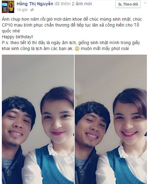 Đang được điều trị tại Quatar sau trận đấu với U23 UAE vừa rồi và sắp được phẫu thuật. Trong ngày sinh nhật, chị gái Hòa Minzy đã đăng lên trang cá nhân của Công Phương nhận ngày sinh nhật để chúc mừng.