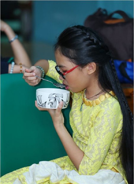 Những bữa ăn vội sau hậu trường là điều cô bé thường phải đối mặt mỗi khi đi diễn.