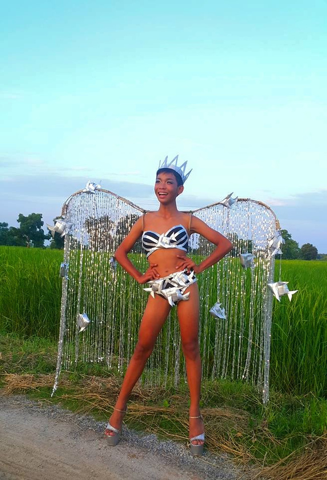 Một anh chàng với thân hình khá mảnh khảnh đang vô cùng tự tin sải bước trên sàn catwalk là con đường làng quê. Tuy nhiên, điều đặc biệt hơn cả chính là việc cậu bạn táo bạo diện bikini và mang một đôi cánh thiên thần tự chế ở phía sau lưng cùng một chiếc vương miện khá ... dễ thương.