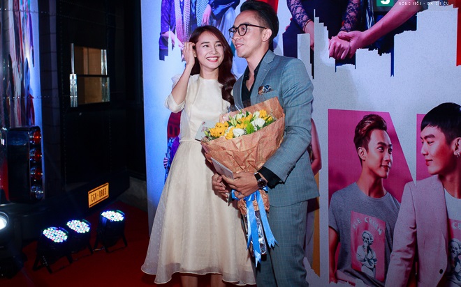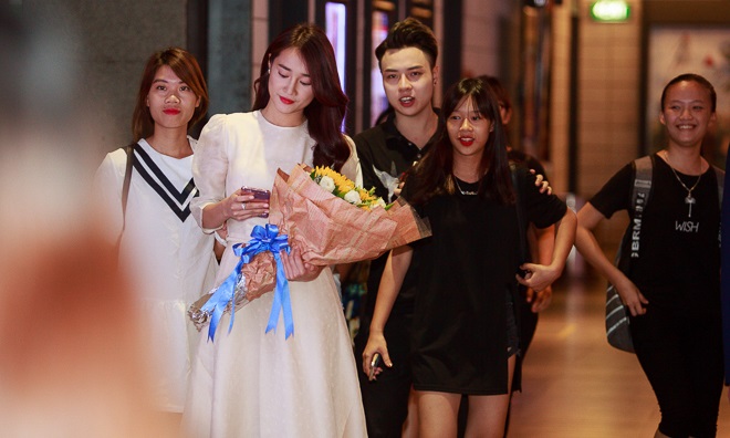 Tối qua, cô xuất hiện cùng một nhóm fan, trên tay cầm bó hoa lớn tại một rạp chiếu phim ở Hà Nội