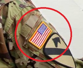 Theo điều luật quân đội số 670-1: ‘Quốc kỳ Mỹ được gắn trên vai trái hoặc vai phải; vùng ngôi sao hướng về phía trước, để ở mép bên phải của lá cờ. Vì khi để như thế này, lá cờ sẽ hướng về bên phải của người nhìn, tạo ra cảm giác lá cờ đang bay trong gió khi người đeo di chuyển về trước’.