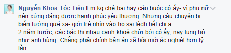 Khi bị Tóc Tiên "bật" lại, người này tức giận cho rằng Tóc Tiên là ca sĩ thì nên dùng từ ngữ lịch sự. Trong khi đó, nữ ca sĩ đáp: "Bạn vào facebook người khác mắng mỏ - đánh phủ đầu người ta thì cho rằng mình lịch sự hơn ai chăng?! Tôi bình luận không hề thô lỗ văng tục chửi thề - tôi cũng chả xưng 'mày-tao' mà rất lịch sự là 'tôi- bạn'! Tôi không thể biết được bạn hơn hay kém tuổi, tôi chỉ biết có vẻ như bạn học luật - thế nên ăn nói có logic hơn bạn nhé".