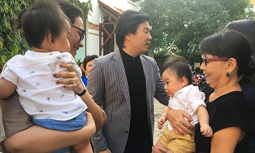 Cặp song sinh của Thanh Bùi chưa quen với đám đông nên khóc nhiều. Vợ của Thanh Bùi phải bế con vào trong dỗ dành
