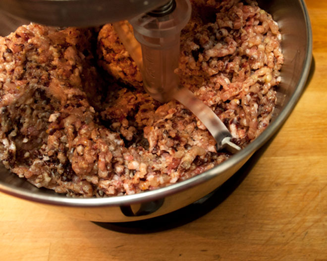 Thêm phần rượu vang ướp lạnh vào hỗn hợp thịt xay và dùng một cái thìa thật dày, cứng, chắc để trộn hỗn hợp thật đều cho đến khi nhuyễn mịn và có bề ngoài đồng nhất (khoảng một phút).