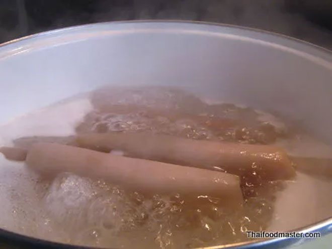 Luộc bì trong nước sôi đến khi miếng bì chín mềm và trong suốt, có thể dễ dàng dùng đũa đâm xuyên qua. Quá trình này có thể mất 40 phút.