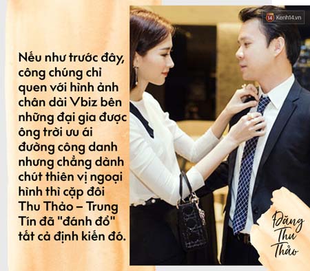 Người ta thường nói "hồng nhan th́ bạc phận" hay ông trời không cho ai tất cả. Nhưng có lẽ, Đặng Thu Thảo là người đẹp hiếm hoi được ưu ái nằm ngoài quy luật đầy trái ngang này. Giữa năm 2015, cô công khai t́nh cảm với Nguyễn Trung Tín– CEO một công ty bất động sản trong sự ngỡ ngàng của công chúng. Ngỡ ngàng v́ sự "liều lĩnh" đột ngột của Thu Thảo và hơn hết sửng sốt bởi sự xứng đôi vừa lứa của cả hai.